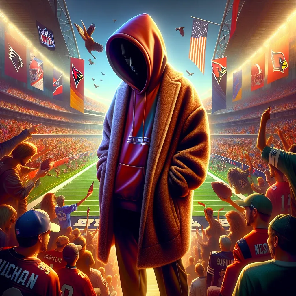 A cozy, oversized coat draped over a thoughtful figure, standing amidst a vibrant NFL stadium filled with cheering fans. The character resembles Gotou Kisaragi from "K-On!", embodying both solitude and connection, with an oversized hood shadowing their face. The soft fabric glimmers in warm autumn hues, reflecting a sense of safety and comfort. Surrounding the figure are dynamic, animated elements that blend seamlessly with realistic stadium details—colorful banners, bright lights, and excited expressions of the crowd. Shadows dance around, creating an electric atmosphere, while the background hints at the iconic Dallas Cowboys and Cardinals game, merging streetwear style with personal philosophy, evoking feelings of nostalgia and belonging