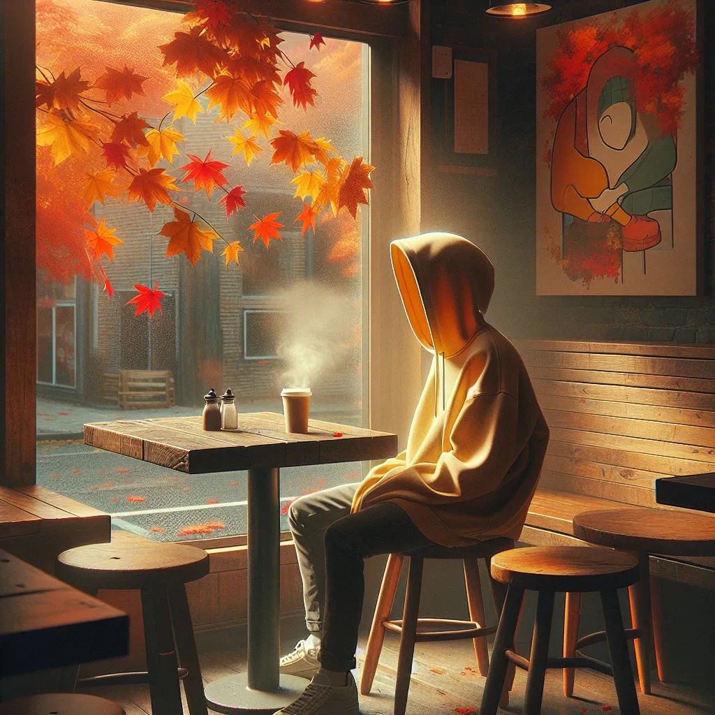A cozy coffee shop scene in autumn, featuring a young person wearing a faded yellow hoodie, sitting alone at a rustic wooden table. The hoodie’s fabric is soft and worn, with a spacious hood pulled up, creating a sense of sanctuary. Outside, vibrant orange and red leaves drift down, while steam rises from a warm drink. The atmosphere is warm and inviting, with soft lighting casting gentle shadows. In the background, hints of anime characters, like Yui Hirasawa, are subtly integrated into the decor, symbolizing introspection and comfort. The overall scene reflects a blend of streetwear style and personal growth, capturing a moment of tranquility amidst the chaos of life