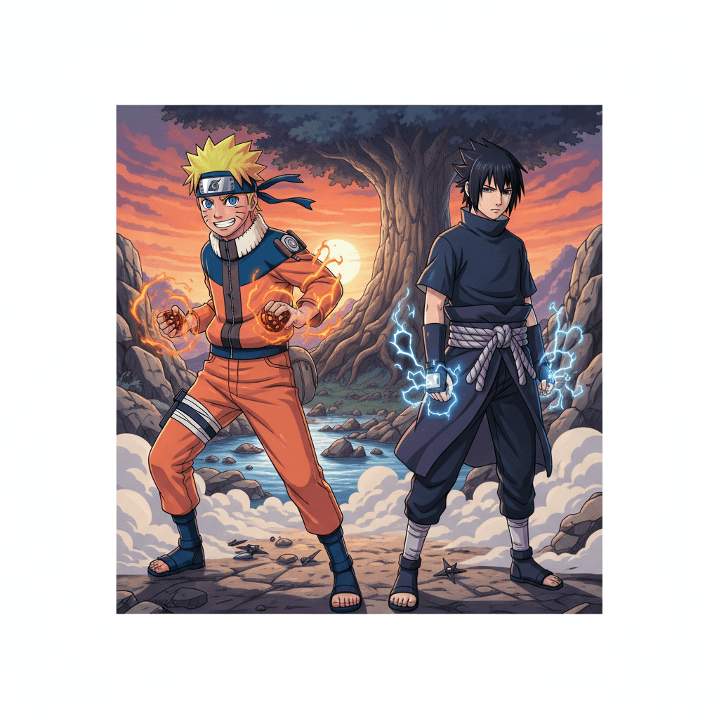Vibrant Naruto Uzumaki in his iconic orange jumpsuit, exuding energy and determination, alongside a brooding Sasuke Uchiha in a contrasting blue-black ensemble, showcasing their personalities through fashion details and ninja accessories