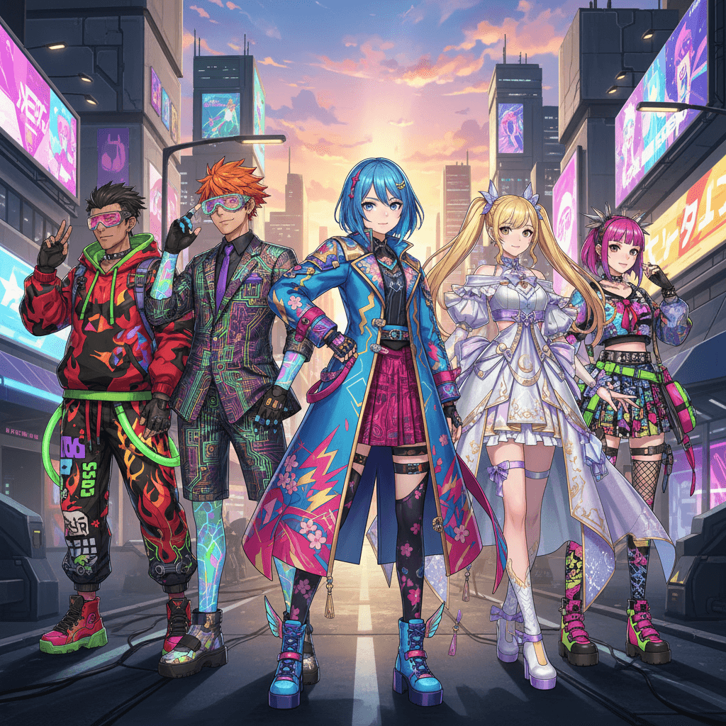 Anime characters dressed in vibrant, statement outfits with unique patterns and colors, showcasing styles inspired by series like "My Hero Academia" and "Sailor Moon," blending fantasy with contemporary fashion trends