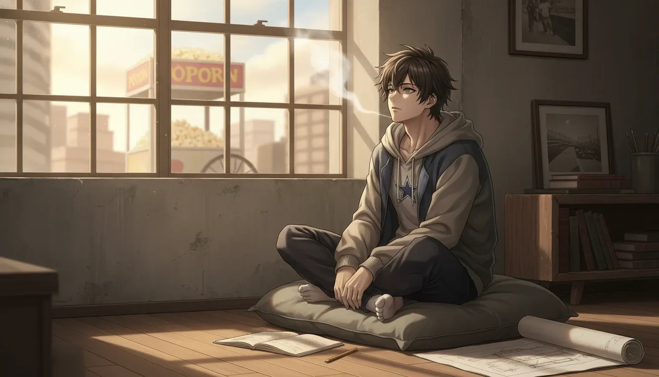 A cozy, worn hoodie with the Dallas Cowboys emblem, draped over a figure in a minimalist urban room. Soft autumn light filters through the window, casting warm shadows. The scene includes a window with the smell of popcorn wafting in, and faint sounds of cheering fans outside. The character resembles a favorite anime hero, embodying strength and vulnerability. Textures of fabric and surrounding details create a nostalgic atmosphere, blending stillness with the anticipation of movement