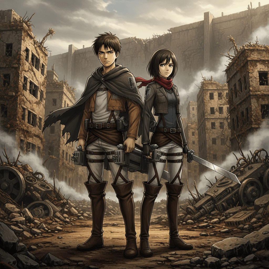 Eren Yeager stands confidently in a rugged Survey Corps uniform, earth tones emphasizing his readiness for battle. Mikasa Ackerman appears beside him, her fitted jacket showcasing resilience. The contrasting styles reflect their personalities in a post-apocalyptic backdrop, merging function and fashion from Attack on Titan