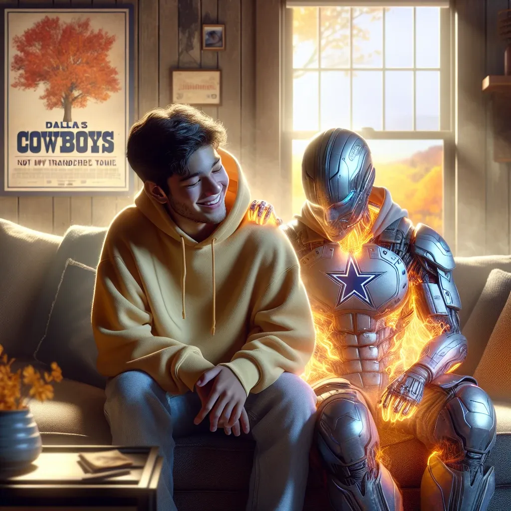 A young man wearing a soft yellow hoodie sat on a comfortable sofa, with a smile on his face and fingers gently caressing the delicate texture of the clothes. The surrounding environment was warm and peaceful, with a poster of Dallas Cowboys hanging on the wall and soft sunlight shining through the window, reflecting the autumn scenery. In the picture, there is Kaito's figure, dressed in battle uniform, slightly sideways, resonating with young people, surrounded by warm flames, symbolizing inner strength and warmth. The overall color tone is bright, with interplay of light and shadow, conveying a sense of nostalgia and power interweaving