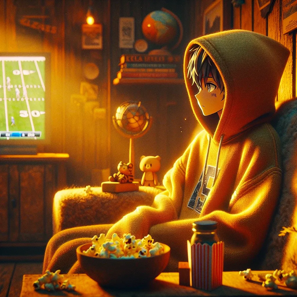 A cozy room filled with warm light, featuring a young anime character resembling Tsuna from *Katekyo Hitman Reborn!*, wearing a slightly worn, buttery-yellow hoodie that wraps around him like a comforting cocoon. He sits on a plush couch, the glow of a TV showing a Dallas Cowboys game flickering in the background. The atmosphere is calm, with soft shadows dancing on the walls, creating a nostalgic feel. Scattered around are popcorn remnants and adventure memorabilia. Tsuna's expression is reflective yet determined, embodying gentle strength. The textures of the hoodie contrast with the cozy environment, symbolizing vulnerability and resilience