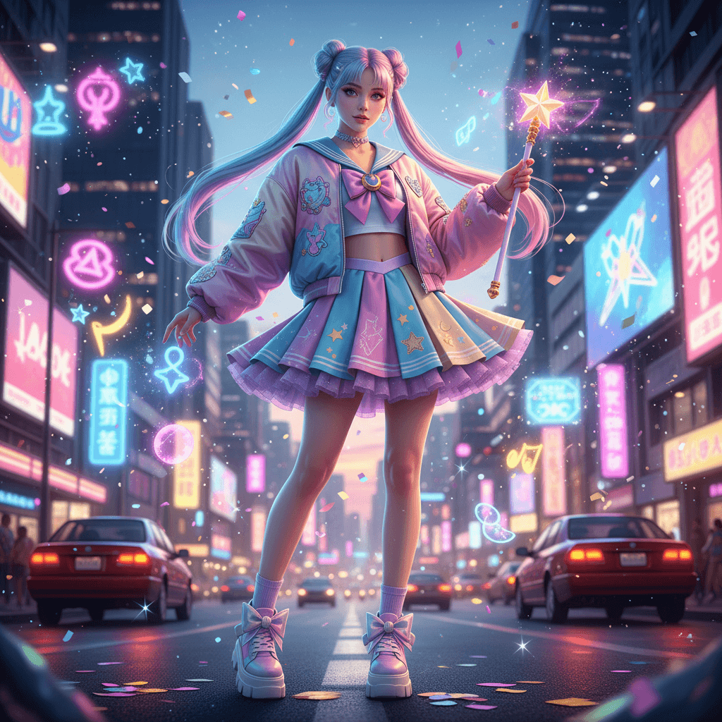 a fashionable young woman wearing a vibrant outfit inspired by Sailor Moon, featuring a mix of pastel colors, a flared skirt, and a stylishly oversized jacket, standing in a lively urban setting with a casual yet magical aura