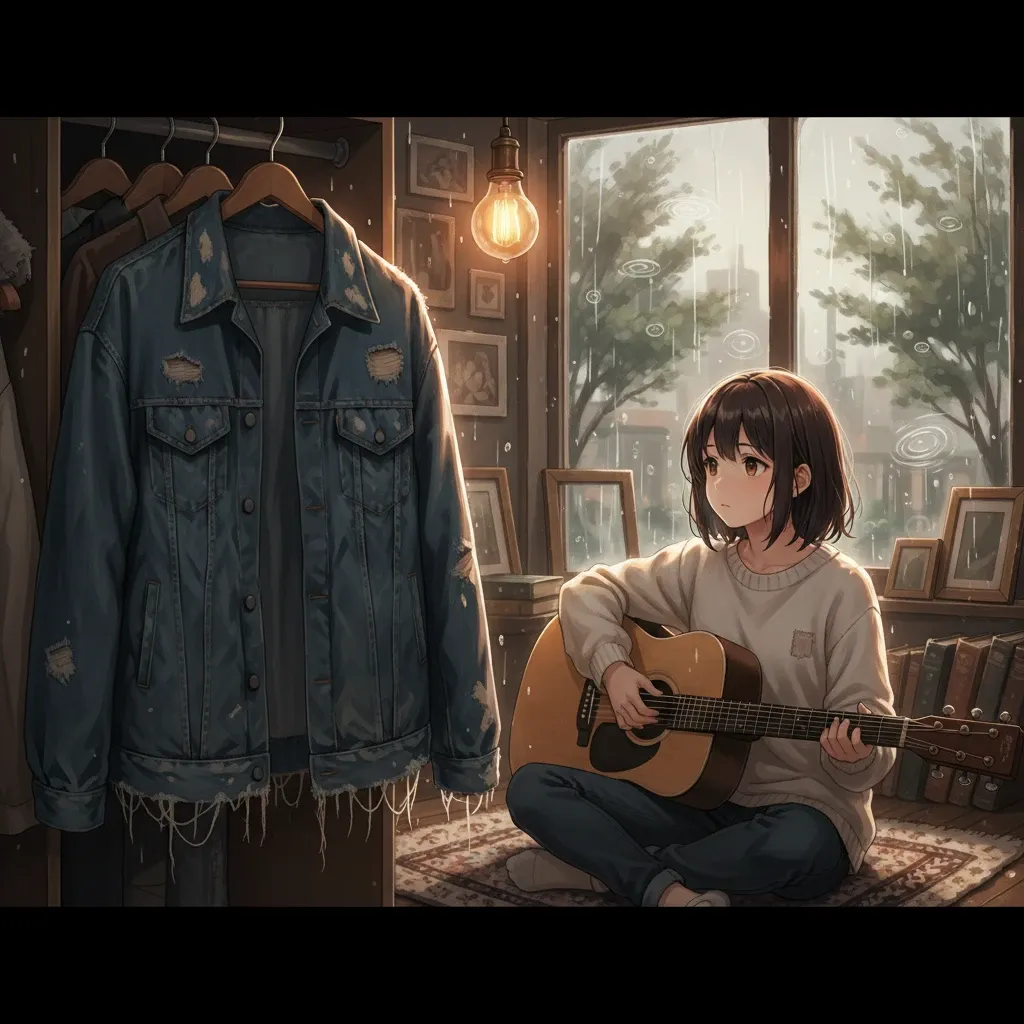 A worn-out oversized jacket hanging in a cozy, dimly lit closet, frayed edges softly illuminated by warm light. A young woman resembling Aki from "K-on!" sits nearby, strumming her guitar, her expression reflective. The atmosphere is serene, blending anime style with realistic details—soft fabric texture, gentle shadows. Outside the window, raindrops create a rhythmic pattern, symbolizing the chaotic world beyond, while the soft sway of wind is felt through the scene, evoking a sense of nostalgia and comfort