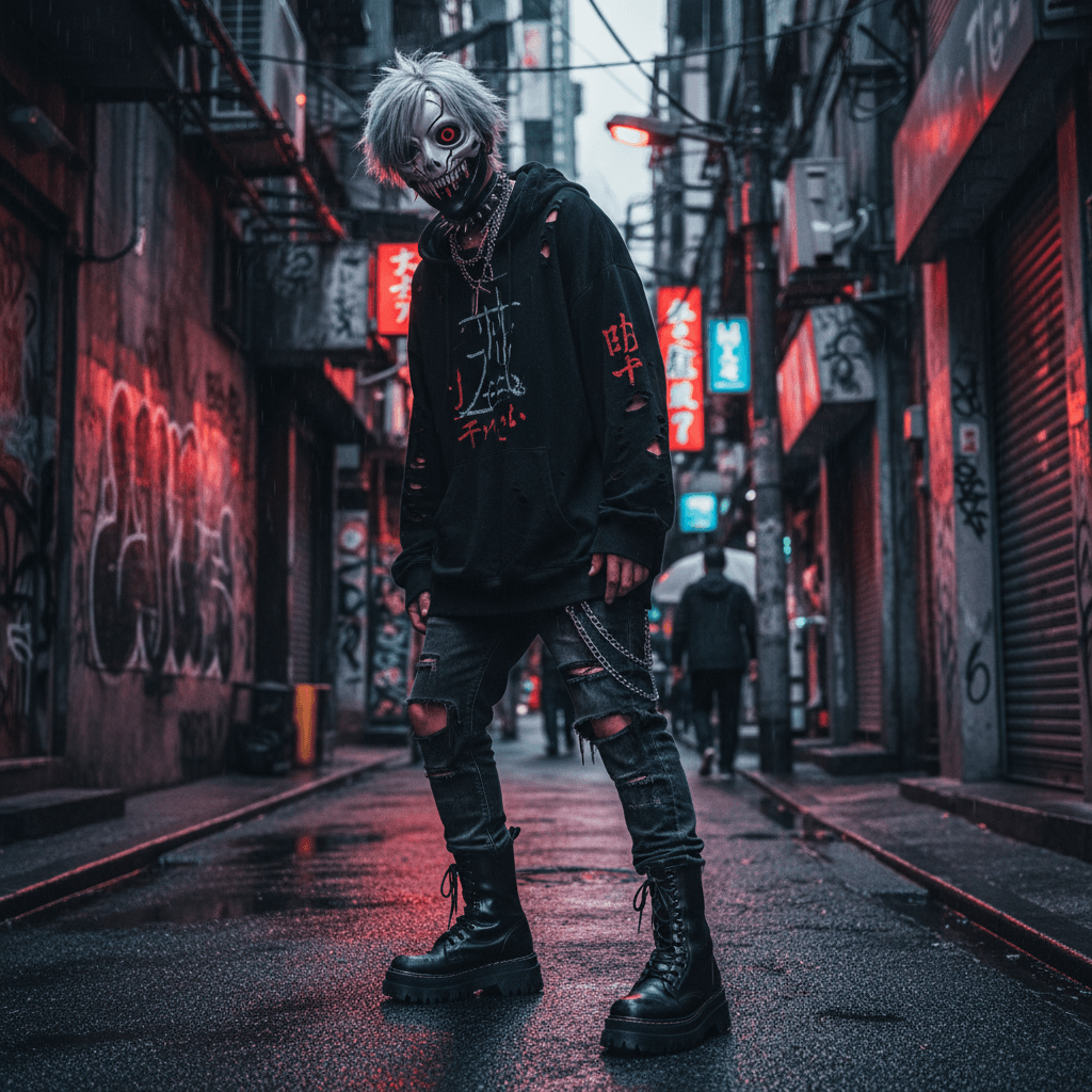 A bold Tokyo Ghoul inspired street fashion scene featuring a character in an oversized black hoodie, distressed jeans, and combat boots, accessorized with a ghoul mask and layered chokers, set against a gritty urban backdrop